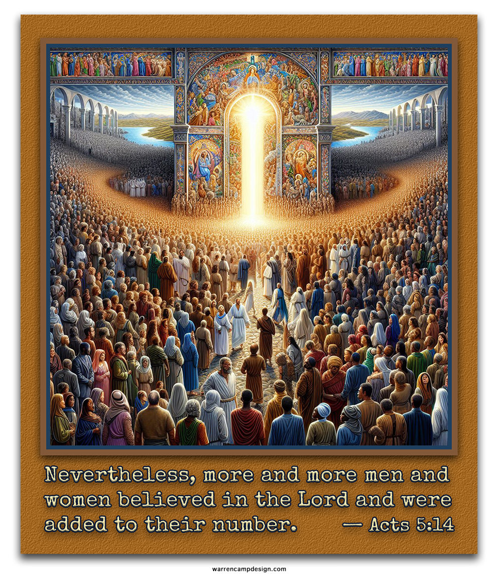 12The apostles performed many signs and wonders among the people. And all the believers used to meet together in Solomon’s Colonnade. 13No one else dared join them, even though they were highly regarded by the people. 14Nevertheless, more and more men and women believed in the Lord and were added to their number. 15As a result, people brought the sick into the streets and laid them on beds and mats so that at least Peter’s shadow might fall on some of them as he passed by. 16Crowds gathered also from the towns around Jerusalem, bringing their sick and those tormented by impure spirits, and all of them were healed.