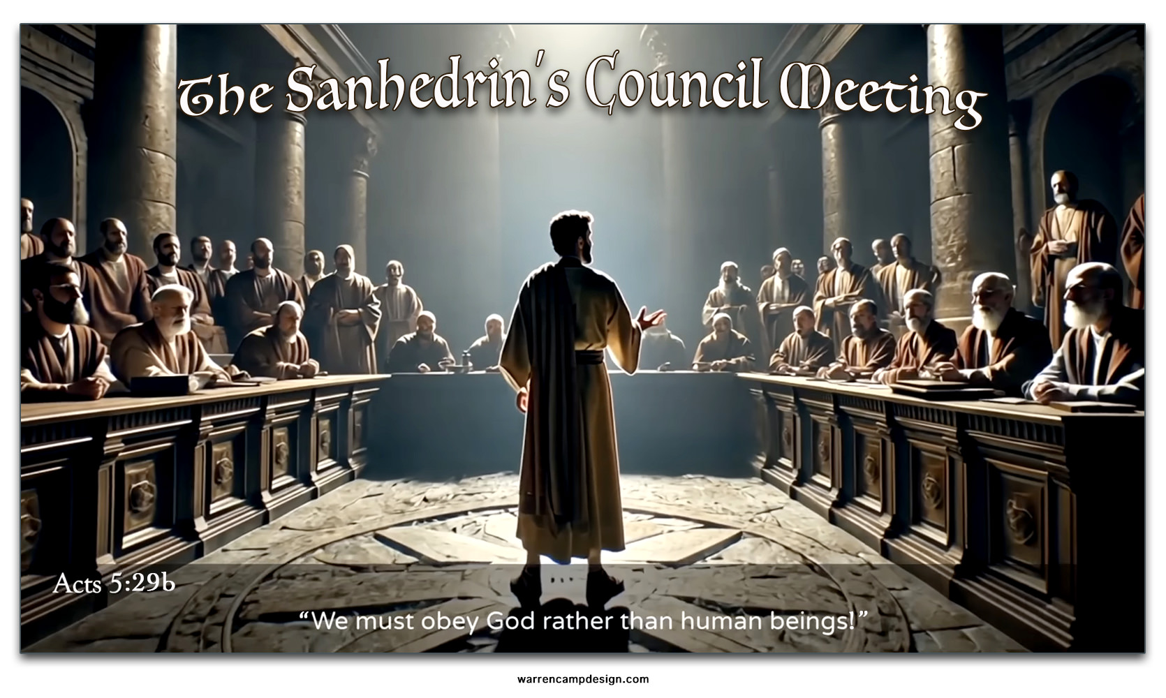 In our movie are three scenes: Scene 1 will be in the temple area, at Solomon’s Colonnade, where the saints met daily, and where multitudes of unbelievers gathered in the hope of being healed. Scene 2 is in the Sanhedrin's Council meeting; we'll be there as the Council convenes and as they call for the prisoners to be brought forth, only to learn they've escaped. We'll stand by as the apostles get escorted into the Council from the temple area where they've been preaching. Still in Scene 2 we'll hear the Sanhedrin's accusations and threats, followed by the apostles' response. When the courtroom gets cleared, and the Council hears the recommendation of Gamaliel, we'll witness the Council's threats and the apostles' beating. In Scene 3, the apostles leave the Council joyfully, grateful to be found worthy to have suffered for the name of Christ.