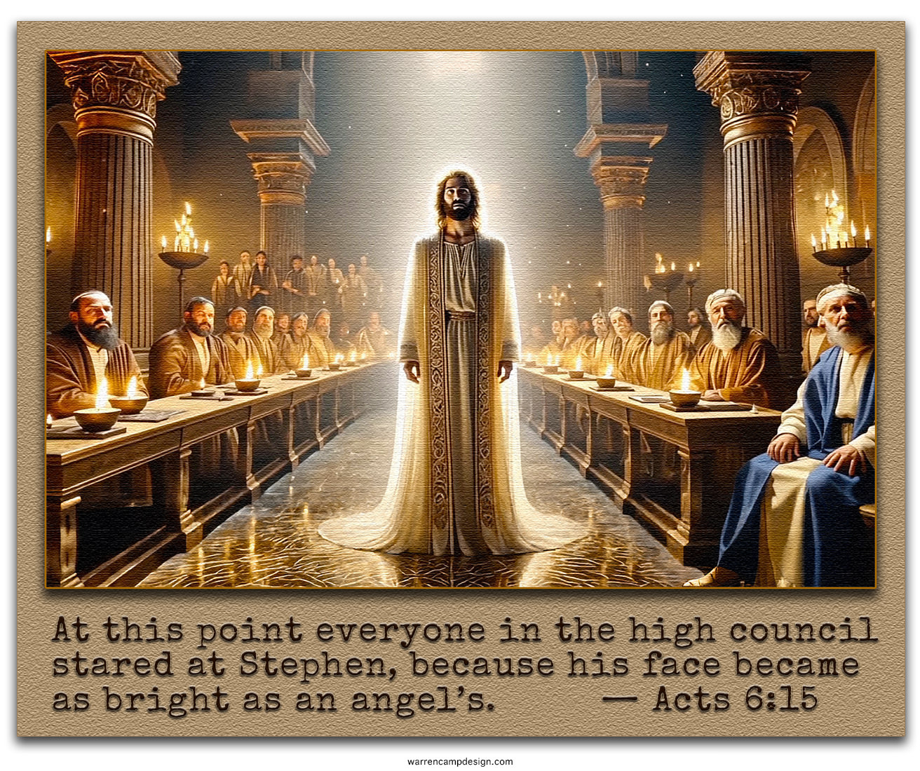 When Stephen came before the council, his face shone like an angel’s (v. 15), radiating the very presence of God within him. The glow was God’s vindication of Stephen. The Sanhedrin viewed him as a rebel against Moses, but Moses was the only other man in recorded history who, at a sublime chapter in his life, drew so close to God that his face reflected divine glory (Exodus 34:29–35).