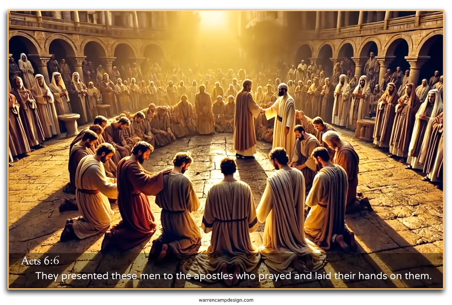 The seven deacons chosen by the congregation met with the apostles who prayed and laid their hands on them as a sign of delegated authority. Once the initial dispute had been resolved in a godly manner, God's blessing again rained down upon his church, which grew rapidly and included many priests as its new members.
