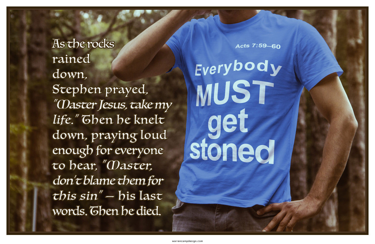Seconds later, the agony of conviction that Stephen had brought to their souls exploded in their anger. With one voice they cried out in protest; together they rushed upon him to drag him away. In the Priests' own hearts they justified themselves by viewing the man as the worst of blasphemers. They proceeded to execute him in the manner dictated by Mosaic Law for a teacher of false religion (Deut. 13:6–11; 17:2–7). They hurried him to a place outside the city and threw stones at him with deadly force. The law regarding stonings required that the first stones were to be hurled by "witnesses to the crime." Thereafter, everyone else would throw additional stones onto "the criminal." In Stephen’s case, the "witnesses of his crime" were those men who'd heard false accusations of Sanhedrin members, most of whom, no doubt, were ruling elders.