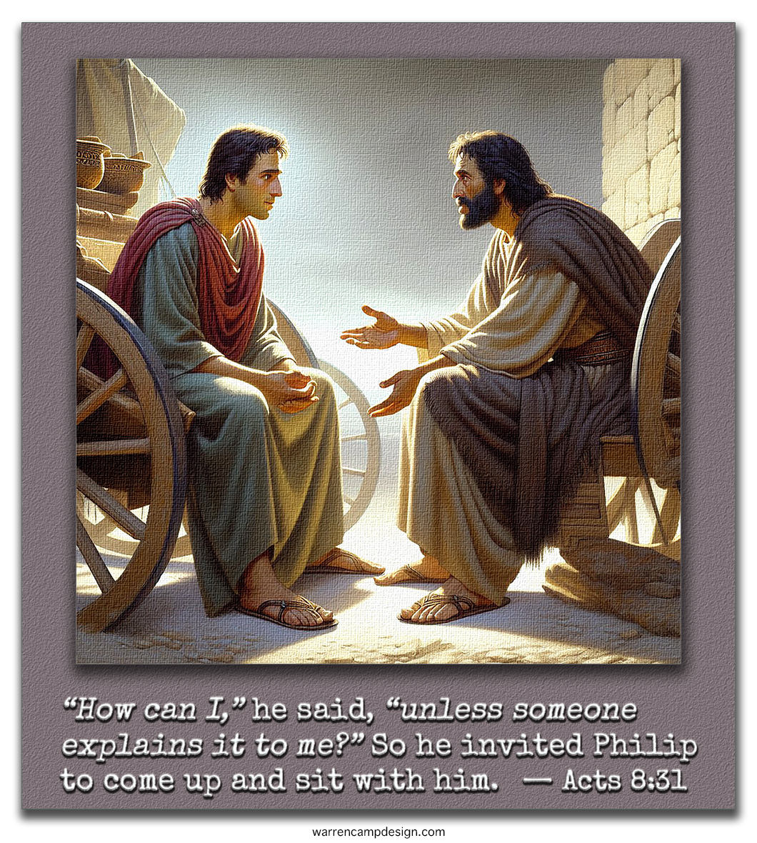 This text in v. 30 — "Philip . . . heard the man reading." — might make you wonder. In the ancient world, it was common to read aloud. So, Philip knew what the Ethiopian was reading by listening to him reading the prophet Isaiah's words aloud. It was good for the Ethiopian to be reading the Bible, but unless understanding was brought to him, little benefit would be gained. Fortunately, God had brought someone to bring the man such much-needed understanding. While it's glorious when we come to understand the great truths of Scripture on our own, God always provides a place and purpose for teachers, preachers, and facilitators in the body of Christ to help people understand Scriptures.