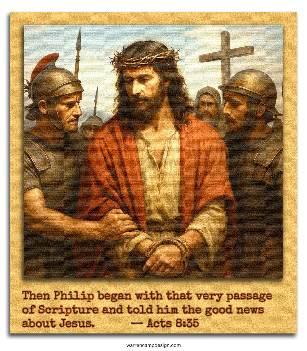 “Then Philip began with that very passage of Scripture.” Philip talked about more than this passage from Isaiah, but this is where he started; it was common ground with the Ethiopian. But Philip made the effort to talk about Jesus, talking easily about Jesus beginning at "that very passage of Scripture." Philip's effective preaching consisted of his explaining who Jesus was (like a quiet, humiliated lamb) and what he'd done for us (having been led unjustly as a sheep to its slaughter). Today, explaining who Jesus is and what he's done for us is the essence of the gospel. May we strive to emulate Philip by talking personally to others about Jesus.