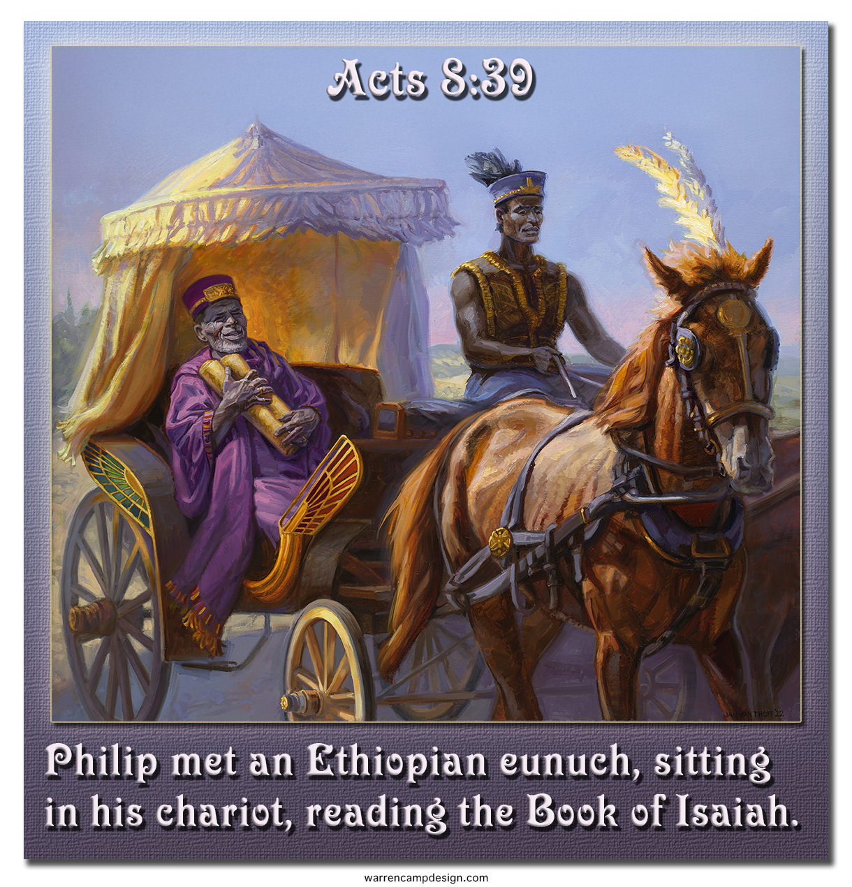 “The Spirit told Philip . . .” It took real boldness for Philip to run right up to the Ethiopian's chariot and speak to him, but that's what the Holy Spirit told him to do. The Ethiopian was a rich man, a man of power; in at least some way he was a celebrity. Yet Philip knew that the eunuch needed Jesus just a much as anyone else. Philip wasn't hesitant to tell a prominent person about Jesus. [How are you doing these days at running up to and telling "important" people about Jesus? If you're afraid to tell people about Jesus, remember that the Spirit of Jesus is telling you to do so; and he'll give you the words, attitude, and conviction to tell your personal story. Don't hesitate to share Jesus' wonderful news to others, whether they're important people or not.]
