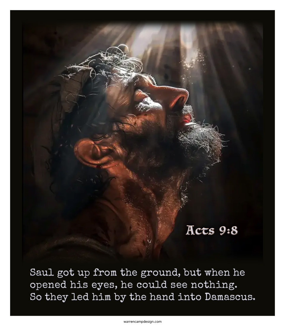 Saul got up from the ground, but was without his sight; he'd been blinded by the great light: “a light from heaven” that flashed around him as he and his companions neared Damascus, where he must have been met by someone appointed by the Lord (v. 6). He was taken to the house of Judas (v. 11), where he neither ate nor drank (nor saw anything) for three days. He knew that the One whom he opposed, the One he thought to be dead, was certainly alive.