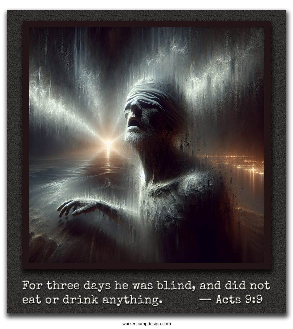 7The men traveling with Saul stood there speechless; they heard the sound but did not see anyone. 8Saul got up from the ground, but when he opened his eyes he could see nothing. So they led him by the hand into Damascus. 9For three days he was blind, and did not eat or drink anything.