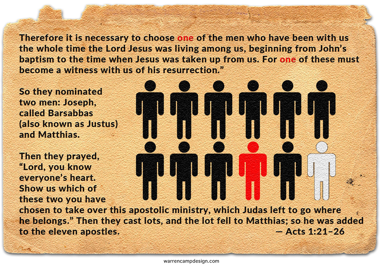 23So they nominated two men: Joseph called Barsabbas (also known as Justus) and Matthias. 24Then they prayed, “Lord, you know everyone’s heart. Show us which of these two you have chosen 25to take over this apostolic ministry, which Judas left to go where he belongs.” 26Then they cast lots, and the lot fell to Matthias; so he was added to the eleven apostles.