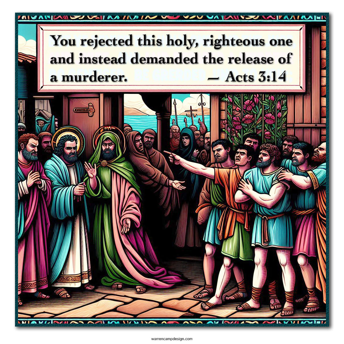 Next, Peter boldly laid the guilt of Jesus’ death squarely where it belonged. Everyone was well aware of what had transpired that year there in Jerusalem. Here, Peter directly laid the blame upon them, since Pilate wanted to free Jesus, which is one of the ironies of Jesus’ crucifixion: While the crowd rejected Jesus, they embraced a criminal and a murderer named Barabbas (enlarge photo). Peter boldly confronted this audience, rebuking them for disowning the Righteous One and freeing a murderer.