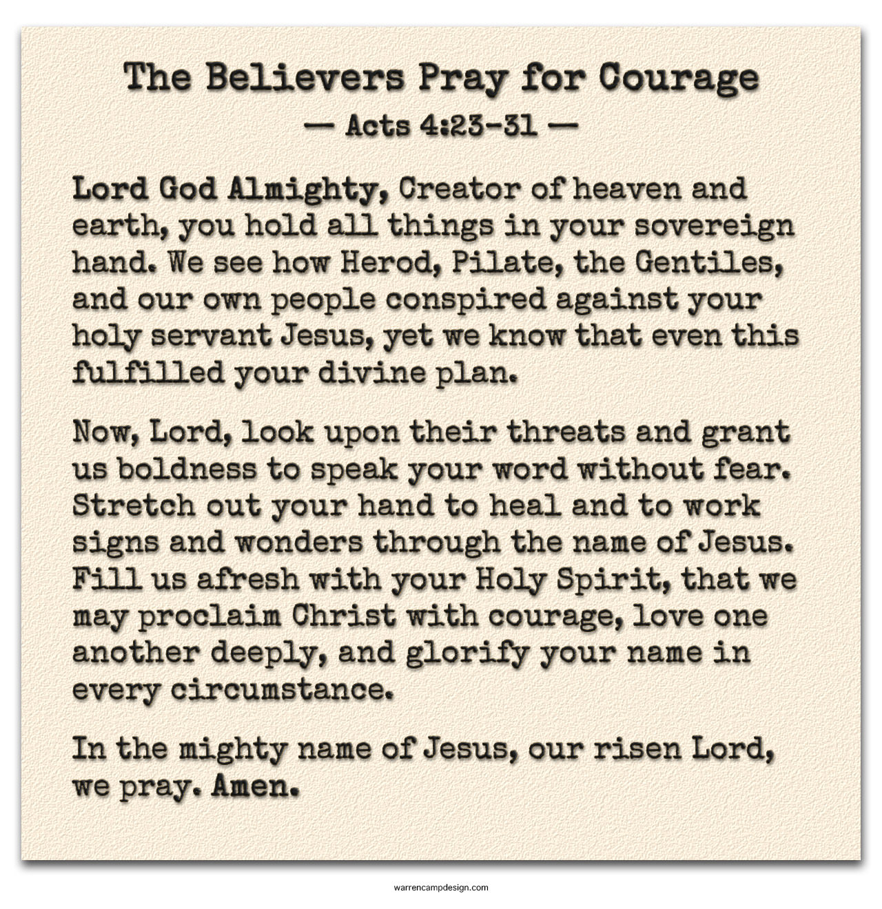 There are at least four reasons why we should pray boldly to our Lord. First, the disciples prayed to God who is all-powerful. We have the same privilege in prayer. Today, we who believe in Christ pray to the same Sovereign Lord. When we’re confronted with opposition, and events seem to be out of control, we must prayerfully turn to our Sovereign Lord. He’ll walk with us through our trials.