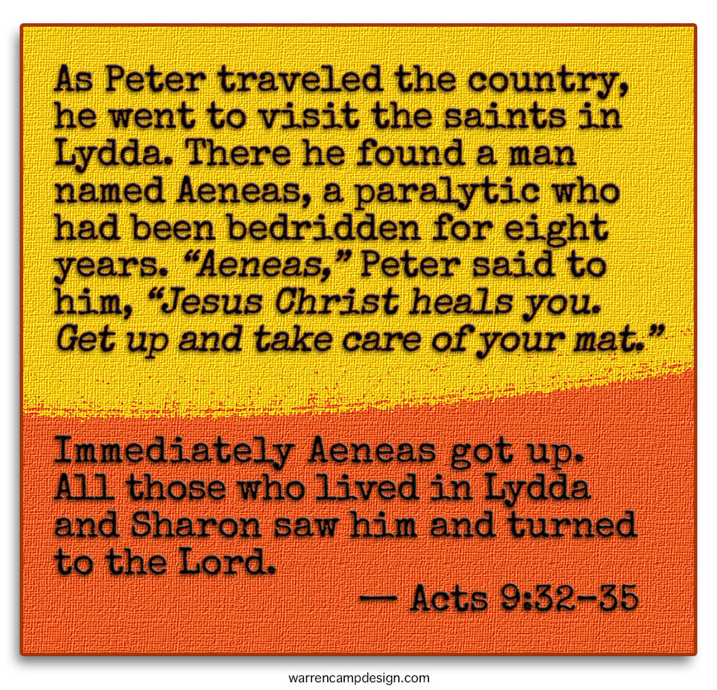 32As Peter traveled about the country, he went to visit the Lord’s people who lived in Lydda. 33There he found a man named Aeneas, who was paralyzed and had been bedridden for eight years. 34“Aeneas,” Peter said to him, “Jesus Christ heals you. Get up and roll up your mat.” Immediately Aeneas got up. 35All those who lived in Lydda and Sharon saw him and turned to the Lord.