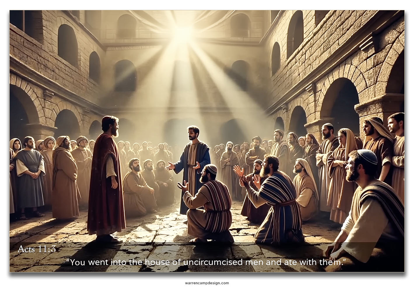The charges against Peter were plain: You, Peter, who are supposed to be a faithful Jew, associated with and even ate with Gentiles! This offended these Christian Jews, so they criticized Peter. We must remember that sharing a meal with someone was an essential sign of fellowship in that culture. However, Peter’s breaking of bread with Gentiles was considered to be a significant compromise to these Jewish Christians. They faulted Peter for having eaten with men who were uncircumcised.