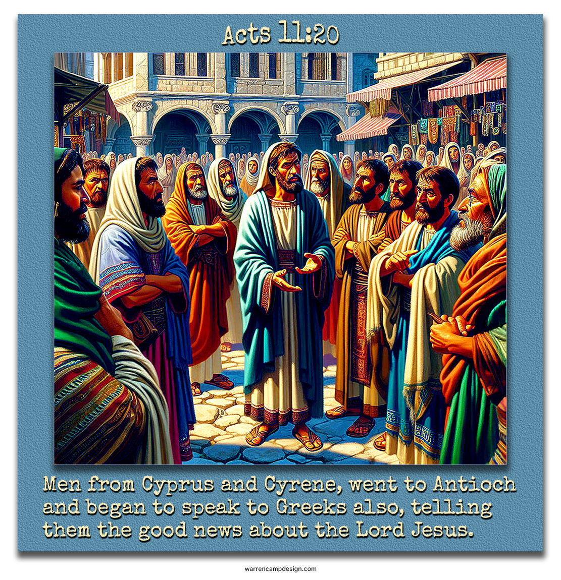 In these twelve verses, believers scattered by Stephen’s persecution preach successfully first to Jews in Phoenicia, Cyprus, and Antioch, but Cypriot and Cyrenean men boldly proclaim to Greeks there too, yielding a great number of converts and sparking joy-filled reports back to Jerusalem. Barnabas is sent to Antioch, where he rejoices, encourages perseverance in the Lord, fetches Saul from Tarsus, and together they teach for a year — earning “Christian” as the disciples’ new name — before prophets arrive, announcing famine, prompting the Antioch church to generously aid their Judean brothers through Barnabas and Saul.