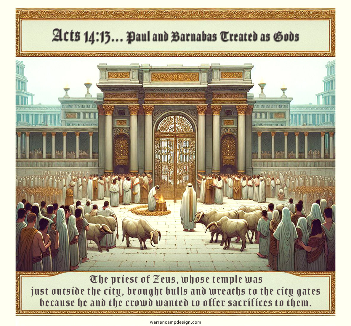 Notice the reversal of Barnabas and Paul in v. 12. As usual, Paul was doing most of the talking while Barnabas tended to remain silent. Thus, the people of Lystra assumed that Barnabas was the greater “god” while Paul was the lesser “god.” Then the priest arrived from the temple of Zeus, just outside the city. He brought with him oxen and garlands, which he was preparing to offer as a sacrifice to Barnabas and Paul (v. 13, enlarge image). Note the order in which Luke puts the two apostles in v. 12.