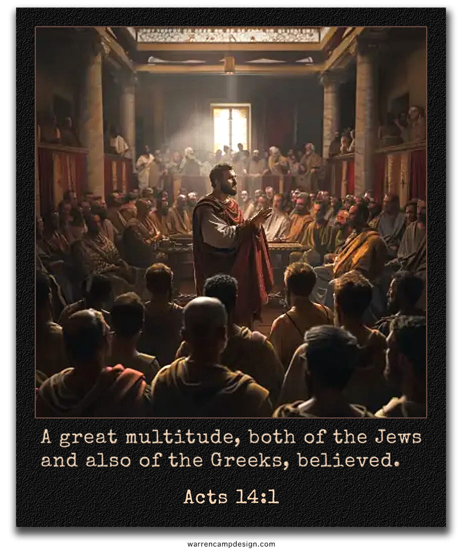 • Paul and Barnabas preach in Iconium, where some Jews oppose them but many Jews and Greeks believe (14:13–4).