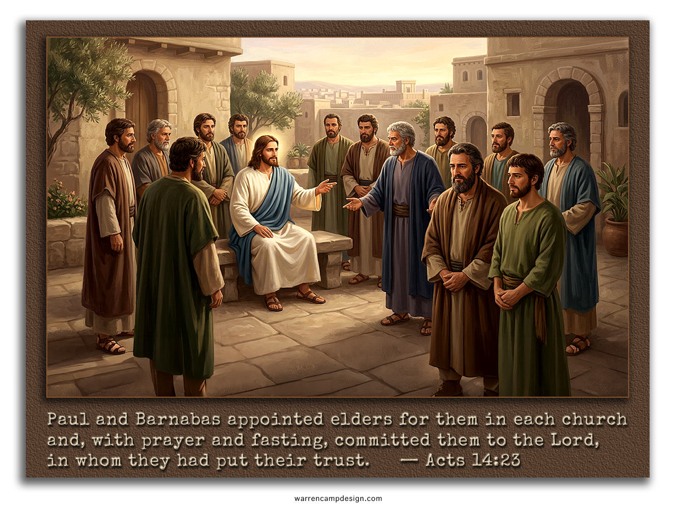 • They appoint elders in each church, pray and fast, and commend the believers to the Lord (v. 23, enlarge the image above).