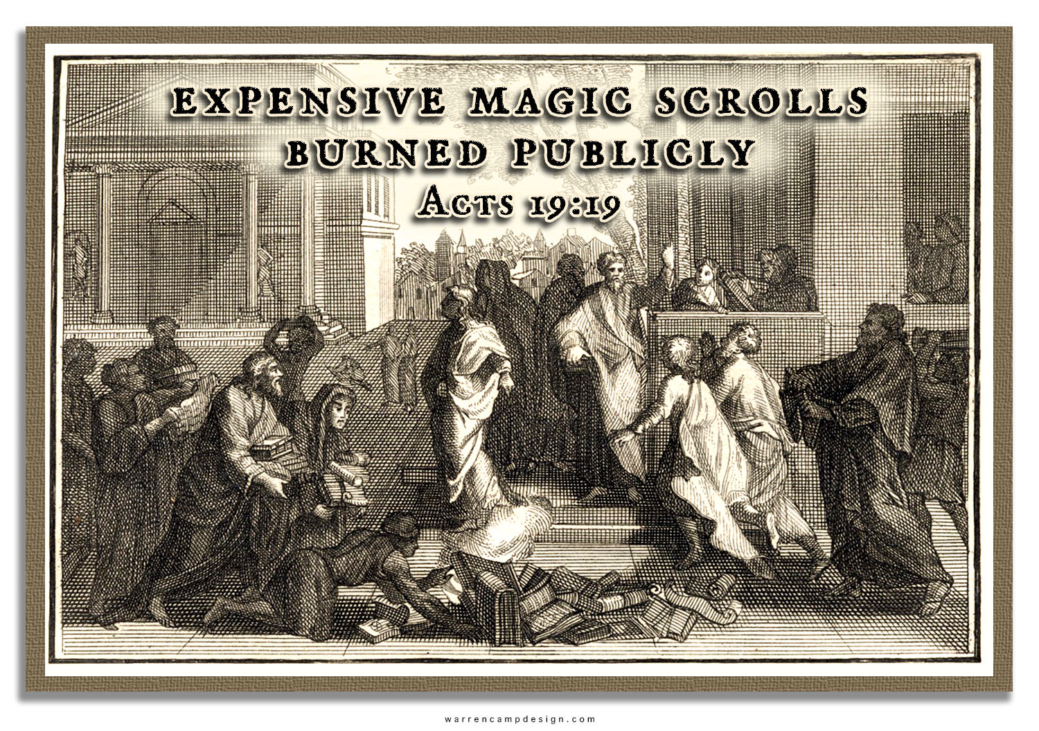 This prompted a massive event of public confession where many of those who practiced sorcery and magic publicly burned their books and scrolls (enlarge engraving image), which were filled with magic charms, amulets, and incantations, known well in the city of Ephesus while being extremely valuable. For example, the value of fifty thousand drachmas (NIV) or pieces of silver (NKJV) today has been estimated at anywhere between $4 million and $5 million.