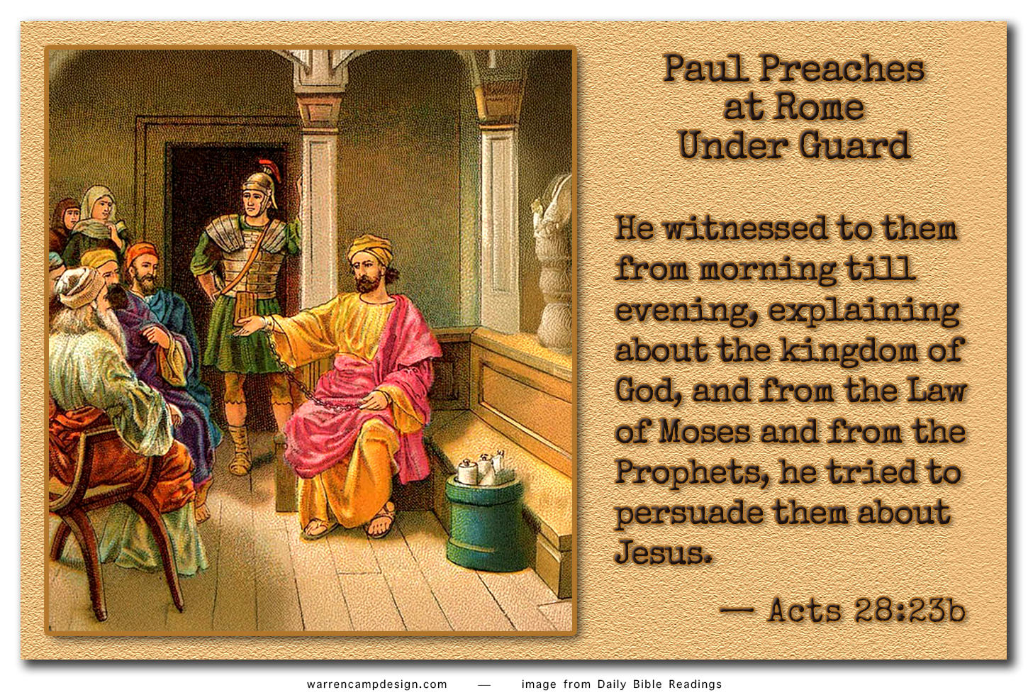 It was at an appointed time that many of the leading Jews in Rome came to hear Paul present the gospel to them. Although he was a great preacher, the method of witnessing that he used on this occasion wasn't preaching. Rather, using teaching as his method, he systematically went through Old Testament Scriptures, showing that every prophecy was perfectly fulfilled in Jesus. From morning till evening, while under Roman guard (see photo), he patiently explained the prophecies, answering all questions. He sought to build faith by highlighting Scriptures about faith. If they'd already put their faith in God's Word, it would be a small step for them to put their faith in the One who was the theme of God's Word.