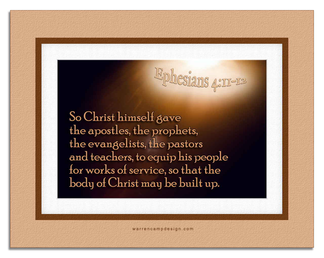 11So Christ himself gave the apostles, the prophets, the evangelists, the pastors and teachers, 12to equip his people for works of service, so that the body of Christ may be built up 13until we all reach unity in the faith and in the knowledge of the Son of God and become mature, attaining to the whole measure of the fullness of Christ (Ephesians 4:11–13 NIV).