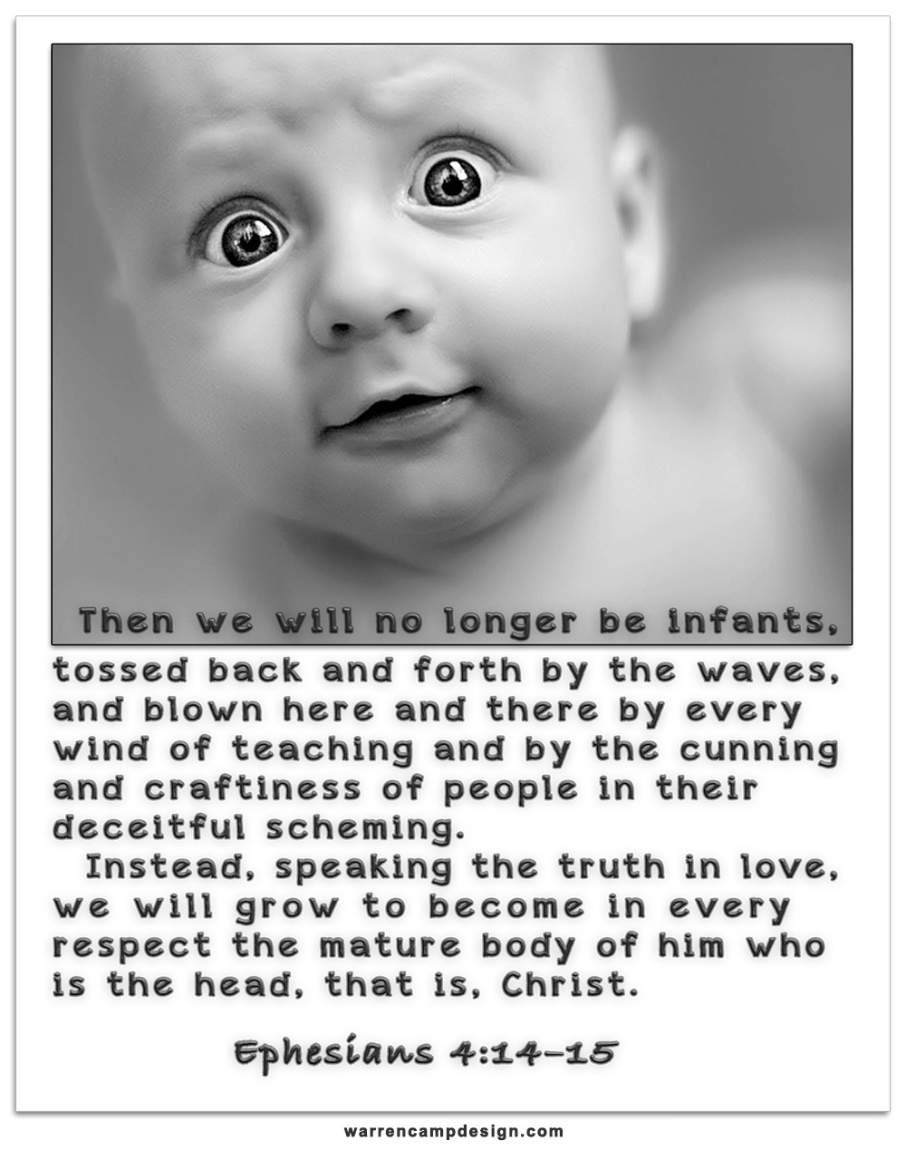 14Then we will no longer be infants, tossed back and forth by the waves, and blown here and there by every wind of teaching and by the cunning and craftiness of people in their deceitful scheming. 15Instead, speaking the truth in love, we will grow to become in every respect the mature body of him who is the head, that is, Christ. 16From him the whole body, joined and held together by every supporting ligament, grows and builds itself up in love, as each part does its work (Ephesians 4:14–16 NIV).