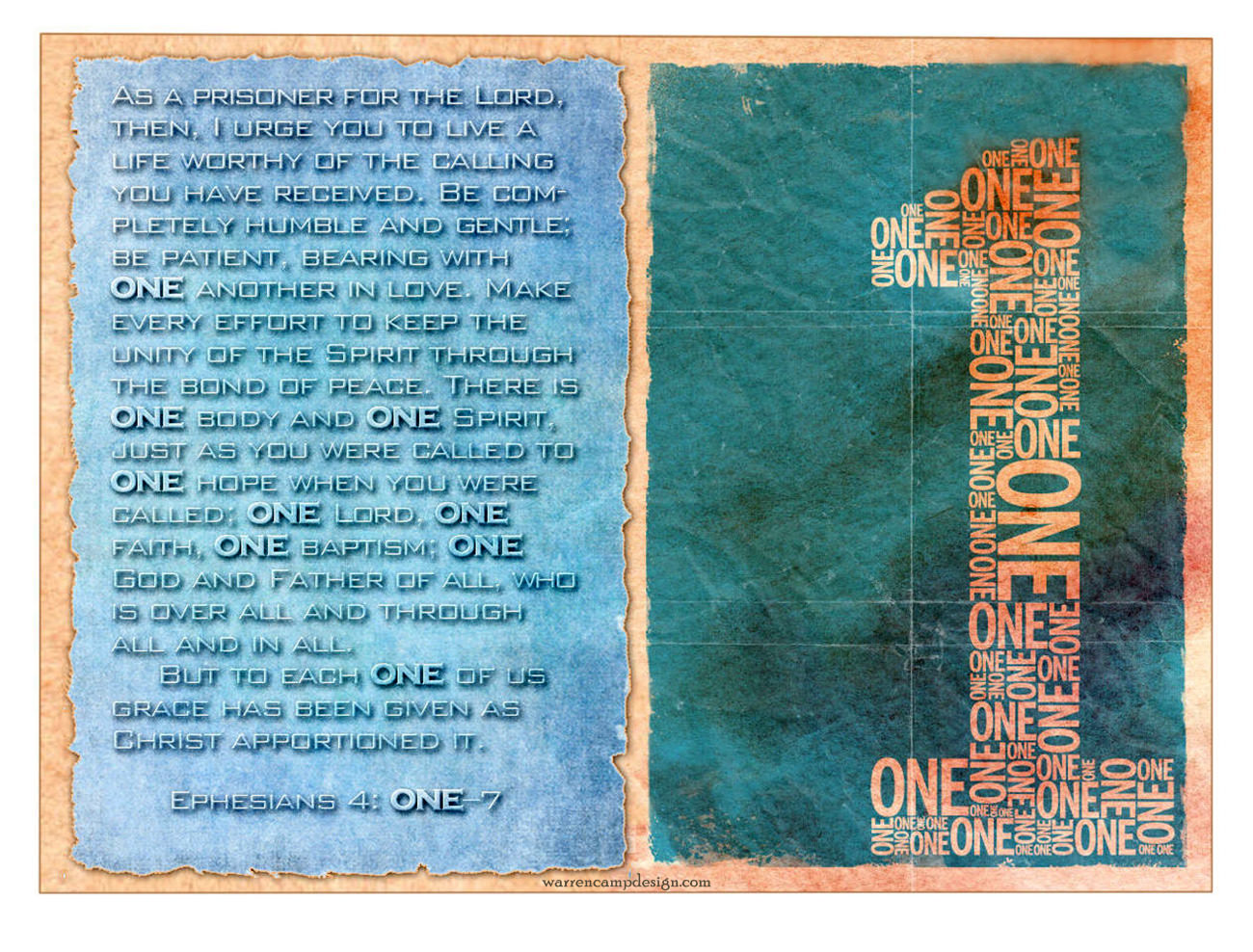 The repeated use of the word “one” in 4:4–8 (as in 2:14–16) highlights the main aspect of the message: the church is “one new humanity” created by Christ. Those who’ve been called by God are to live worthily (v. 1) of that calling, which includes becoming entirely humble, disciplined, gentle, patient, and bearing with one another lovingly, while maintaining unity with the Spirit through peace. Paul exhorts his readers (then and today) to pour ourselves out for each other in acts of love, being alert at noticing differences, and quick at mending fences.
