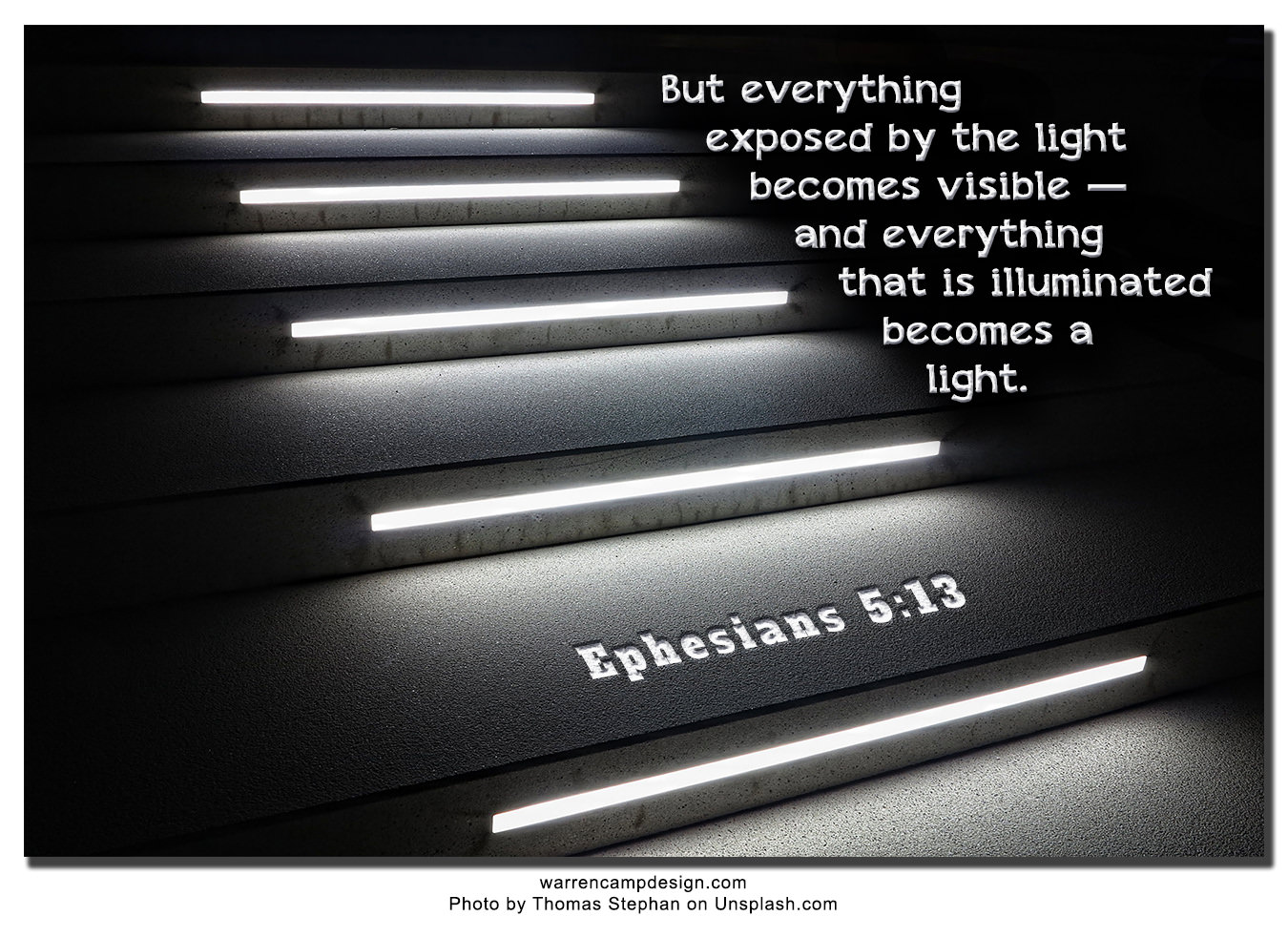 As we’ll see in vv. 13–14, God’s light, which shines through us, illuminates, transforms, exposes, and cleanses us. Those whom the light redeems become visible — that which is visible is light. In other words, after dark individuals get cleansed, they become lights through whom our Savior shines brightly. This is what happened at our conversion when we asked Jesus to become our Lord. We continue to become ever brighter lights when we, through confession and repentance, expose our sin to God and flee from it.