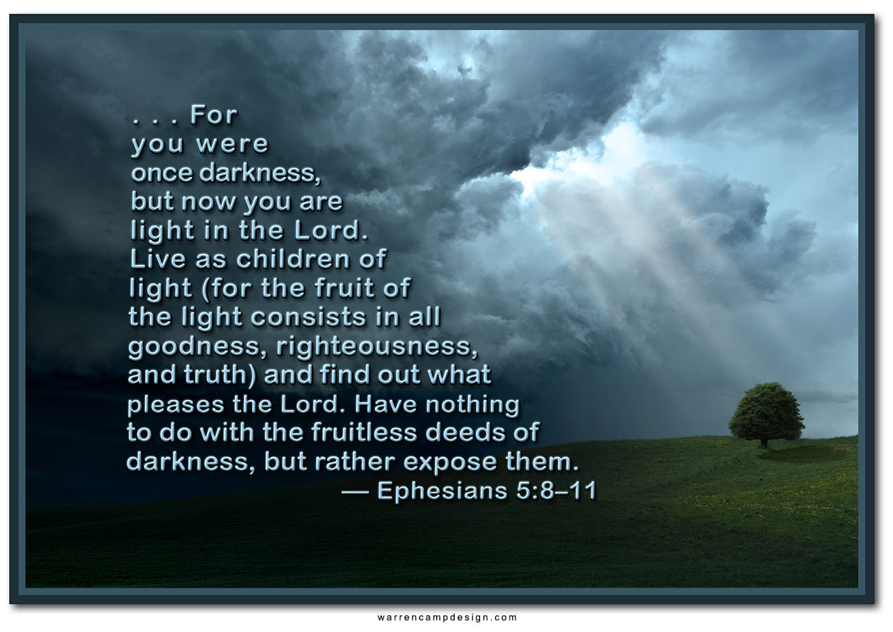 In these three verses, Paul attests: If we walk as children of light, we’ll be good and righteous and become people of truth who’ll learn what pleases our Lord. He repeats the theme: you are children of light, so live like children of light. Note: He doesn’t say only that we were once in darkness; he says we were once darkness itself. Now, we’re not only in the light, we are the Lord’s light.