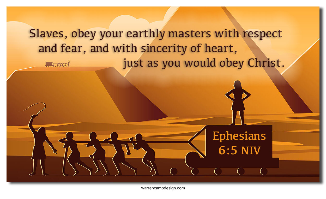 5Slaves, obey your earthly masters with respect and fear, and with sincerity of heart, just as you would obey Christ. 6Obey them not only to win their favor when their eye is on you, but as slaves of Christ, doing the will of God from your heart (Ephesians 6:5–6 NIV).