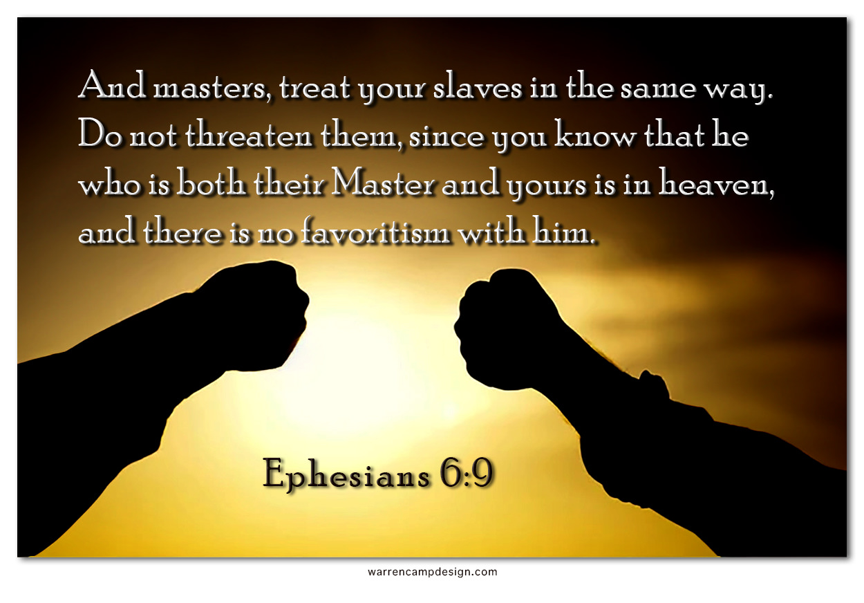 9And masters, treat your slaves in the same way. Do not threaten them, since you know that he who is both their Master and yours is in heaven, and there is no favoritism with him (Ephesians 6:9 NIV).
