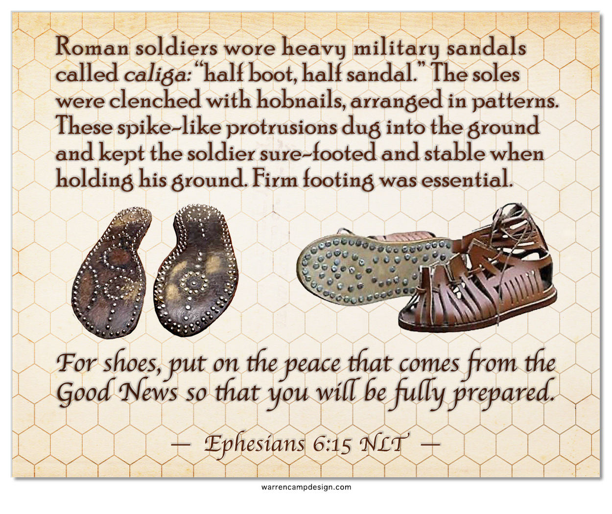 15For shoes, put on the peace that comes from the Good News so that you will be fully prepared (Ephesians 6:15 NLT).
