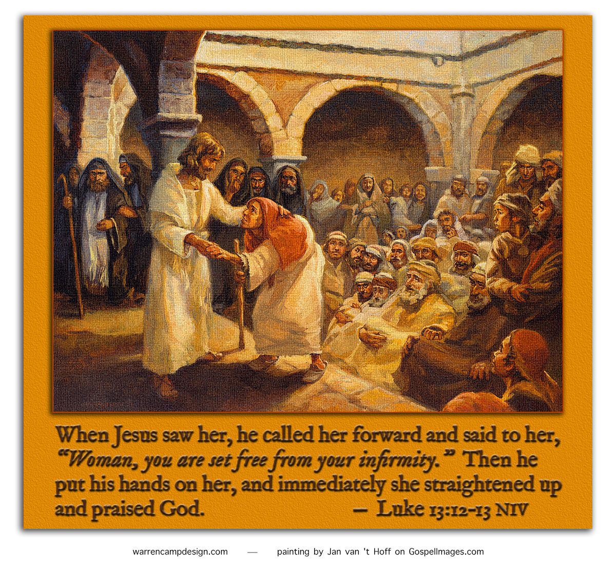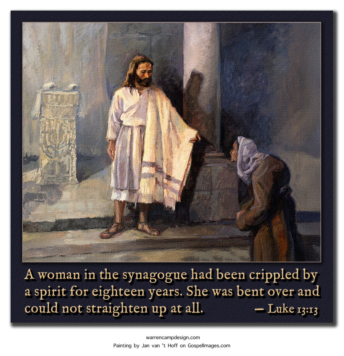 10On a Sabbath Jesus was teaching in one of the synagogues, 11and a woman was there who had been crippled by a spirit for eighteen years. She was bent over and could not straighten up at all. 12When Jesus saw her, he called her forward and said to her, "Woman, you are set free from your infirmity." 13Then he put his hands on her, and immediately she straightened up and praised God.