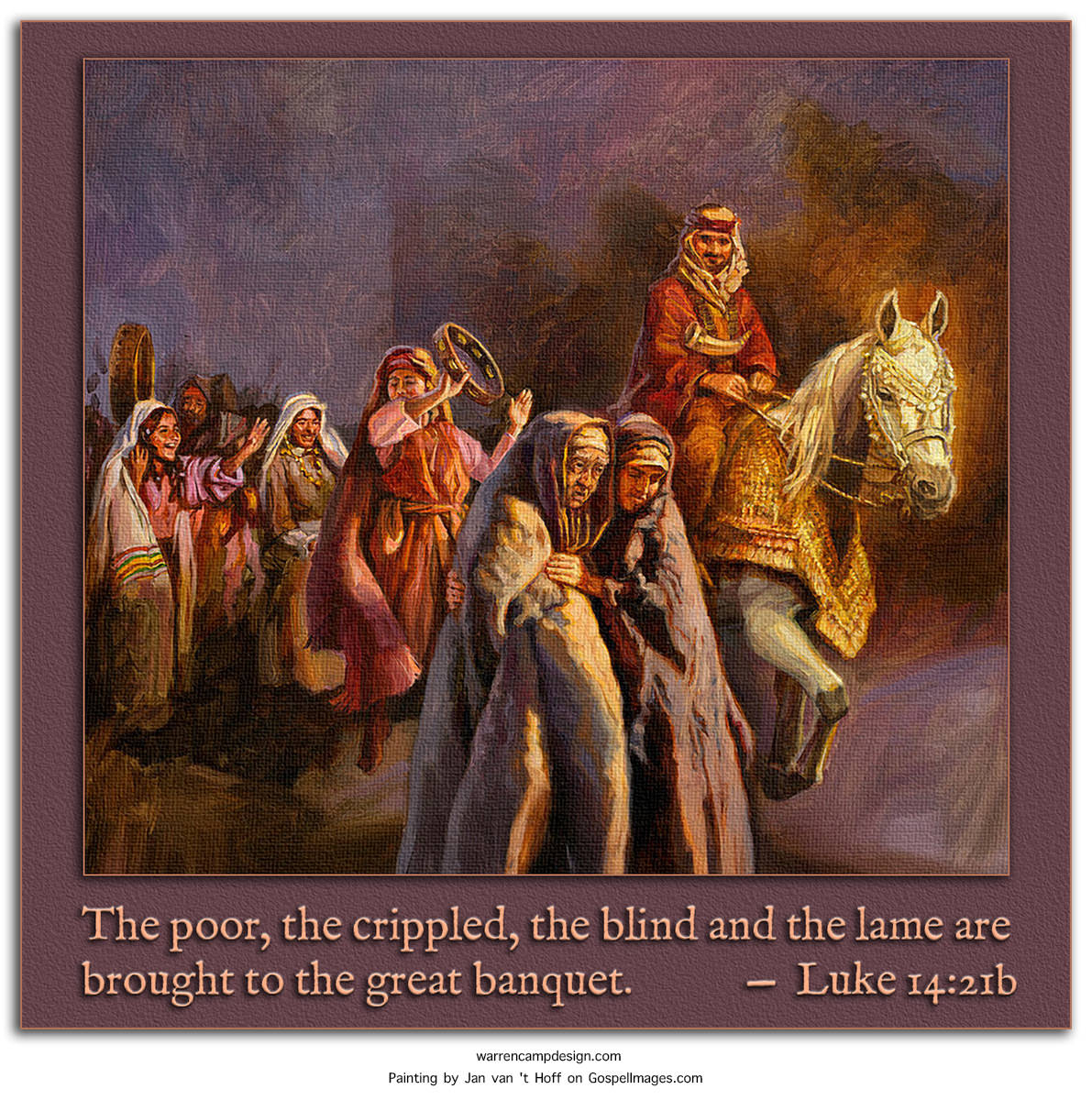 21"The servant came back and reported this to his master. Then the owner of the house became angry and ordered his servant, 'Go out quickly into the streets and alleys of the town and bring in the poor, the crippled, the blind and the lame.'
