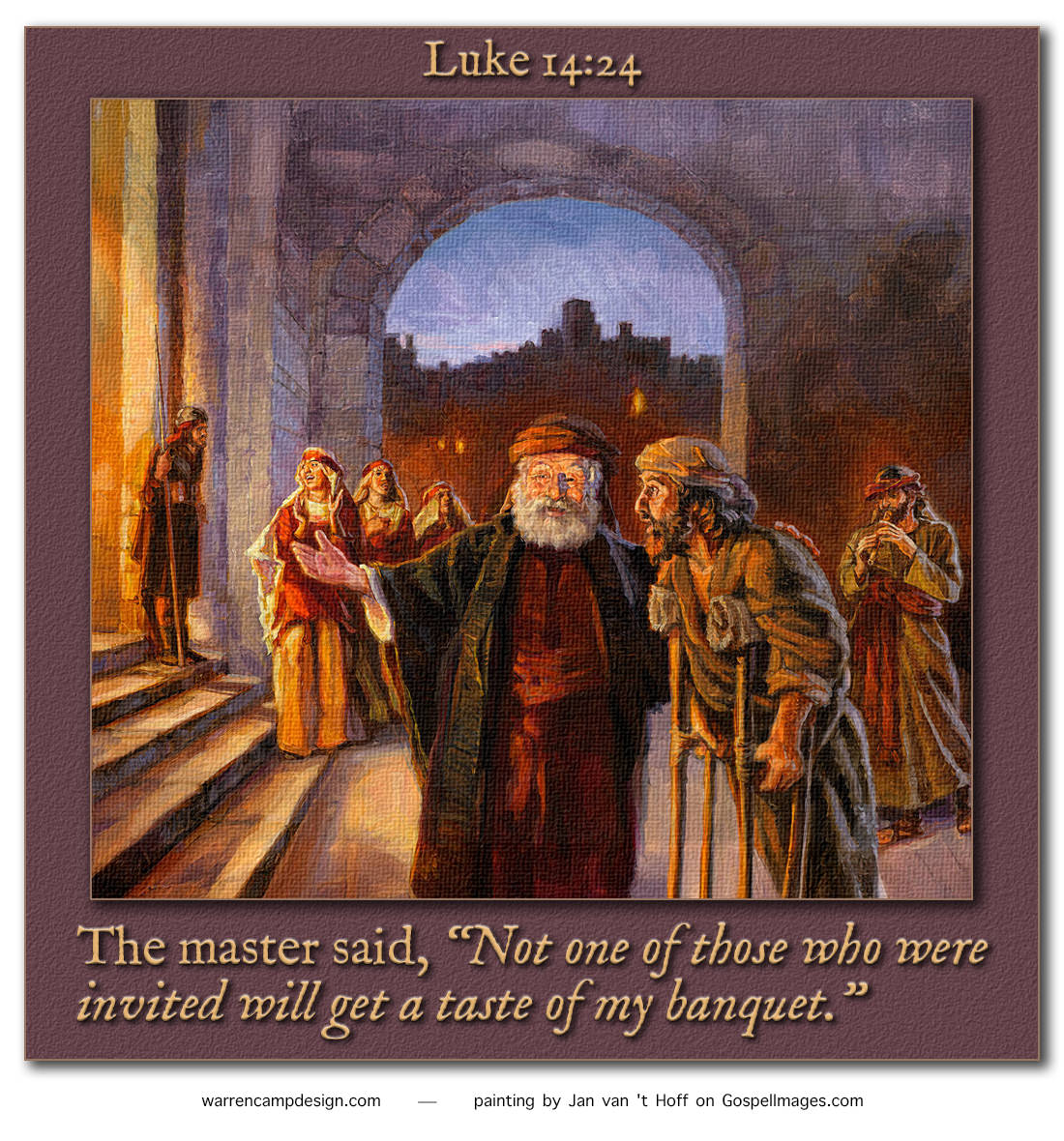 Jesus speaks words of warning to this man and those like him in this follow-up parable (vv. 16–24). He tells of a certain man who plans a great feast, sending out advance invitations to all his many distinguished guests. Seemingly, God is the host in this parable; the feast is the kingdom of God; the invited guests are the people of Israel, the Jews, who implied, by their deeds and words, that they'd surely be part of God's promised kingdom.