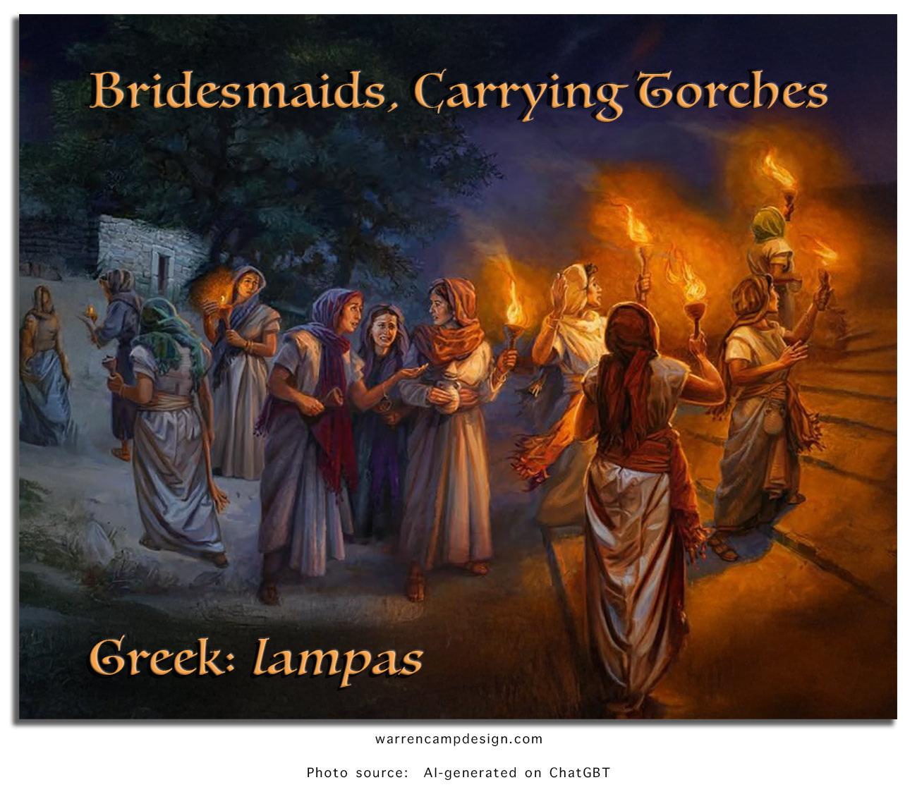 Verse 1 introduces us to ten virgins with their lamps. The Greek word lampas, translated as “torches,” typically refers to a torch or a torch-like device, rather than a small, contained clay oil lamp (lychnos). These torches were made of long or short wooden poles with wire mesh attached to their top so that when filled with cloth that was soaked in oil, it would easily light and remain lit. When people brought torches, they carried a small flask of oil with them to prevent the torch’s light from being extinguished. Further, a torch provides better illumination for a procession than a small clay lamp, which is more suited for personal use, outdoors or in a single room. This aligns with the purpose of the virgins going out to meet the bridegroom. These ten bridesmaids or virgins were on their way to the house of the bride, holding their torches as they walked. Sadly, the foolish bridesmaids, who had no oil, essentially carried a torch that wouldn't light when it needed to be lit.