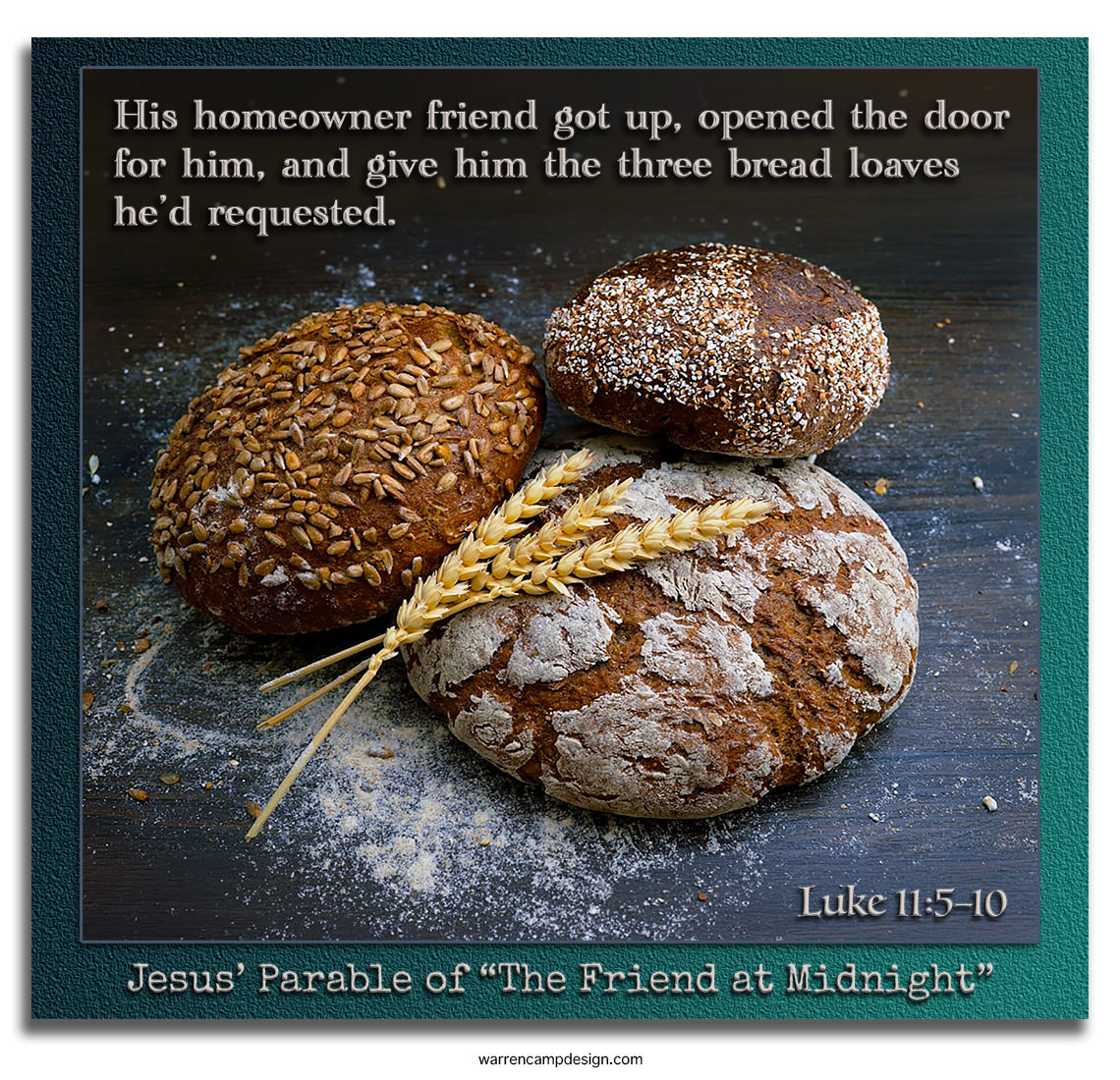 5Then Jesus said to them, “Suppose you have a friend, and you go to him at midnight and say, ‘Friend, lend me three loaves of bread; 6a friend of mine on a journey has come to me, and I have no food to offer him.’ 7And suppose the one inside answers, ‘Don’t bother me. The door is already locked, and my children and I are in bed. I can’t get up and give you anything.’ 8I tell you, even though he will not get up and give you the bread because of friendship, yet because of your shameless audacity he will surely get up and give you as much as you need.