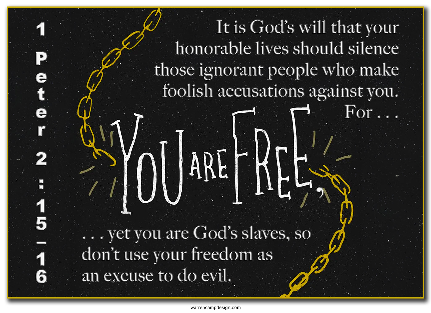 Verse 16c’s “live as God’s slaves” advises us Christians that, although we’re free, we’re also slaves of God. We must never become slaves to sin but always “live as God”s slaves”! We Christians must remember that we’re free-slaves who’ve become slaves to Christ who set us free so we can devotedly serve God.