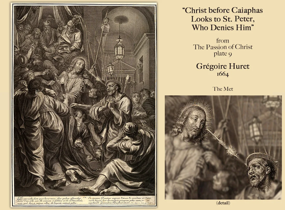 This is Grégoire Huret’s plate 9 in his Passion of Christ series of engravings. In it he has dramatically presented Christ (center) as being besieged by a crowd of men drawing him toward Caiaphas the high priest (background-center). Meanwhile, haloed Peter, to the right, clasps his hands humbly as he looks upwards into Christ’s eyes in a painfully embarrassed yet adoring manner. When you look carefully at the center of Huret’s engraving, you’ll see a bright arrow pointing from Christ’s eyes directly toward Peter’s eyes [see detail].