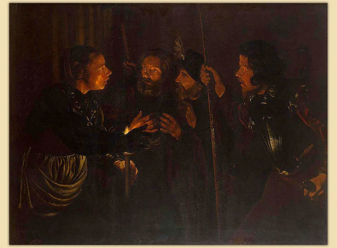 This Denial of St Peter rendition was painted in the 1620s by Gerard Seghers (1591–1651). It’s at the Hermitage Museum in St Petersburg, Russia. [A like-kind depiction of his appears on slide 18.] “After his return to Antwerp from Italy, Seghers became celebrated for his monumental half-height genre scenes and his large religious and allegoric pictures, mostly done in landscape format. These paintings, including his two Denial of St Peter renditions, contain scenes with numerous characters depicted with lively poses and facial expressions, grouped compactly together against an undefined background. The early works of Seghers owe an obvious debt to Gerrit van Honthorst’s style (shown on slides 22 and 25 of this album).”[1]