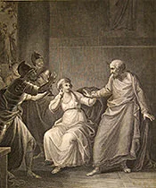 In this Saint Peter Denying Christ painting, Peter the apostle (left), looking down with a frown with one hand at his breast, sits next to a servant girl (center) who has just accused him: “You also were with Jesus of Galilee.” But he denied it saying, “I don’t know what you’re talking about” (Matthew 26:69). Christ (right), while looking down, extends his right hand toward Peter, possibly to comfort him. [See this William Sharp engraving (1779) made following West’s oil-on-canvas painting; also see Valentine Green’s mezzotint print (1780) of this West painting.]