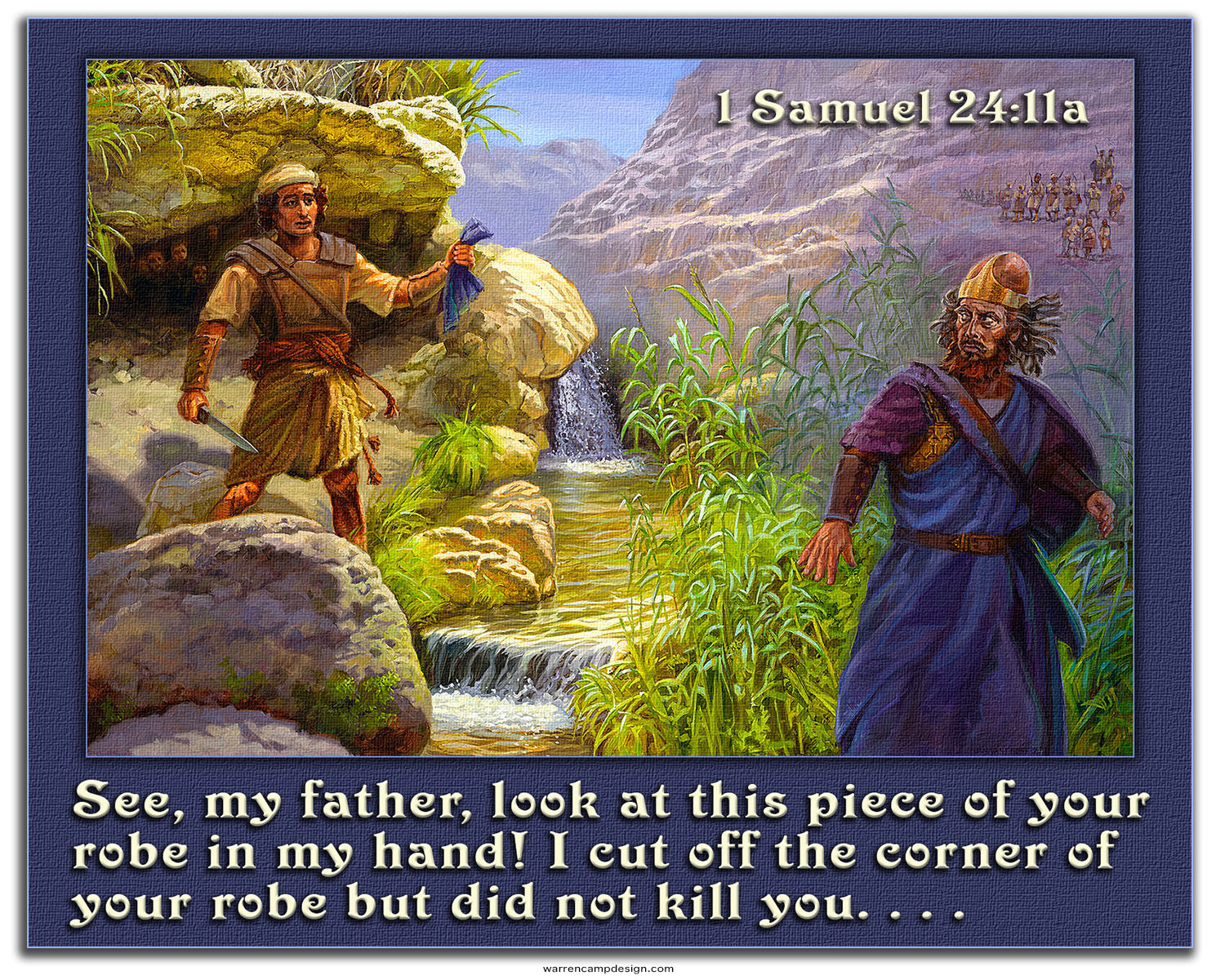 Sincerely, David challenged the charge that he'd sought Saul’s defeat or death, further that he wasn't striving to gain the throne by removing Saul from it. By intentionally (and devotedly) showing Saul the portion of his robe that he'd cut off, David urged Saul to acknowledge that, while he could have quickly and easily killed his king, he refused, because Saul was God’s anointed. To harm the king would have been an act of rebellion against God, who'd enthroned Saul. With Saul’s life in David’s hands, David protected him by keeping his men from killing him. And now, he put his life into Saul’s hands, and ultimately into God’s hands, since he'd made his ultimate appeal to God, to whom he'd sought justice. As a result, he had no need to act against Saul. In the end, David hadn't harmed Saul; he assured him that his hand wouldn't be against him in the future (v. 13); he also reminded the king that his fears about David were exaggerated.