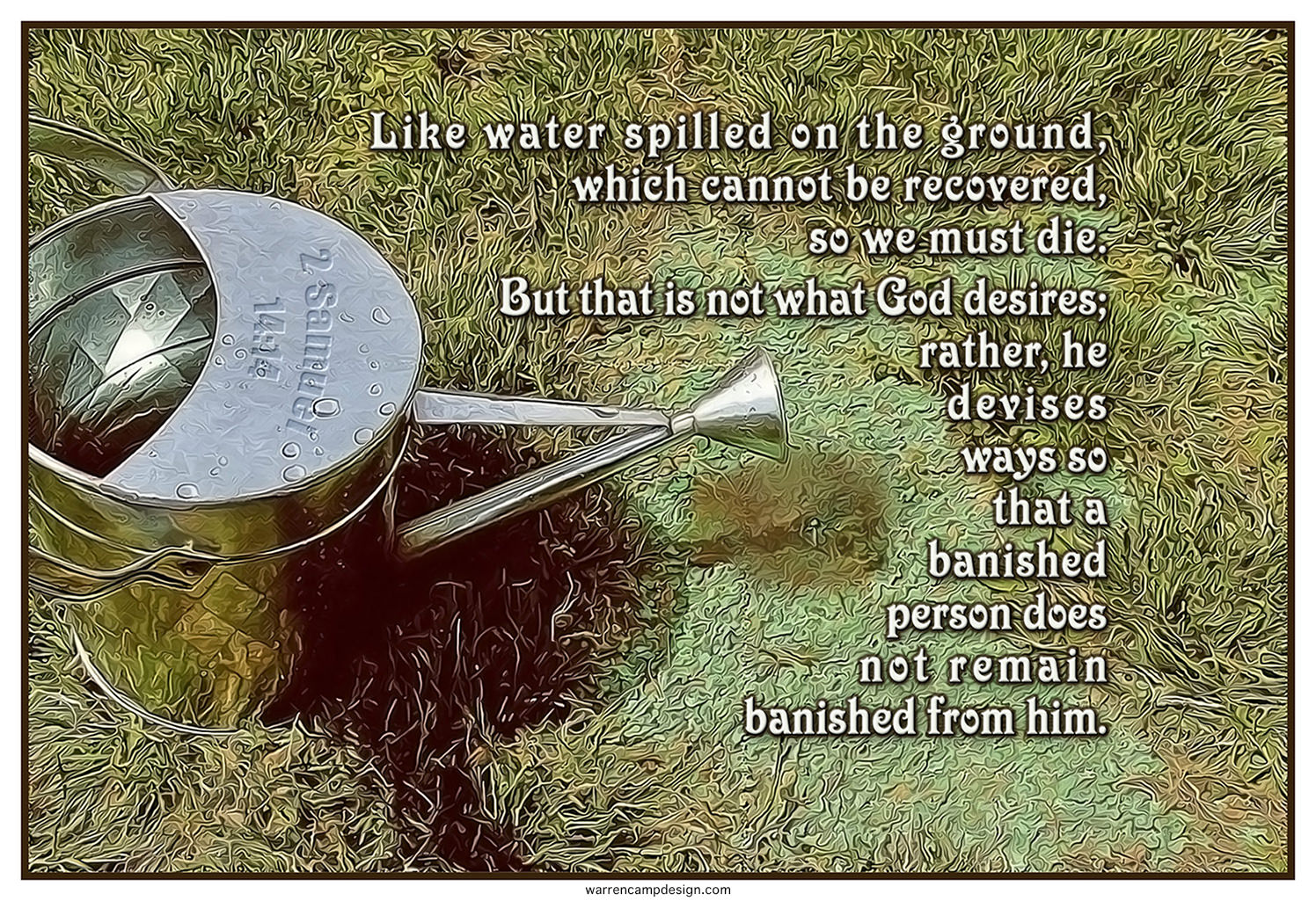 13“Why then have you devised a thing like this against the people of God? When the king says this, does he not convict himself, for the king has not brought back his banished son? 14Like water spilled on the ground, which cannot be recovered, so we must die. But God does not take away life; instead, he devises ways so that a banished person may not remain estranged from him” (2 Sam. 14:13–14).