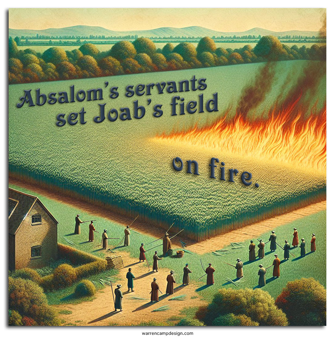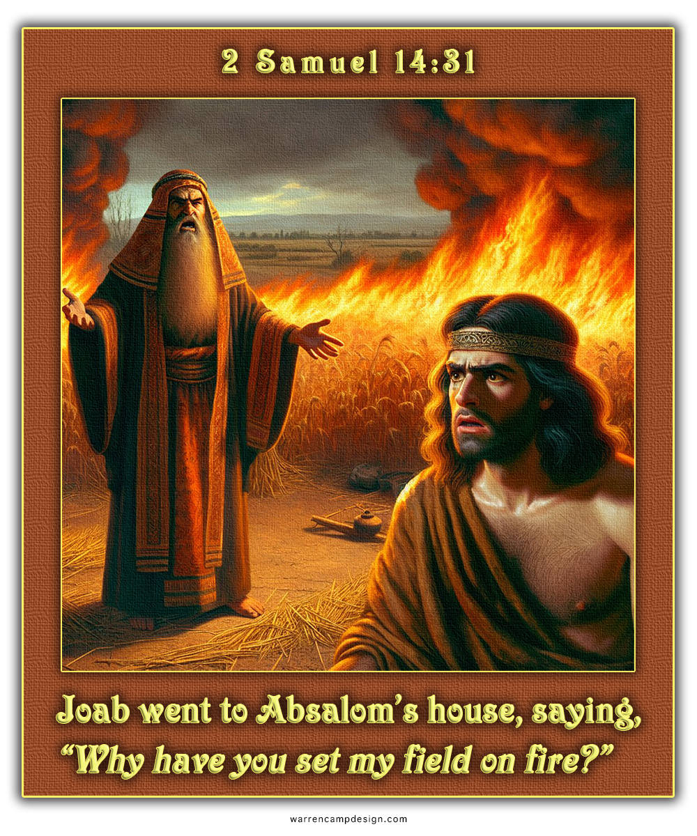 It was Joab who’d helped Absalom return from exile. Now, after two years of house arrest, it was Absalom who needed Joab to help him be restored to the king’s favor. Absalom became more and more frustrated since he couldn’t leave his house. During both years he resented David’s treatment of him so he summoned Joab but was ignored; Joab refused to see him and wouldn’t “return any of his calls,” attempting to gain an audience with Joab in his home. As a result, Absalom took more extreme measures. He sent his servants out to set ablaze Joab’s barley field (which adjoined his own field). This certainly got Joab’s attention! (Enlarge image to the right.) Joab was soon at Absalom’s house to confront him. But instead, it was Absalom who confronted Joab. He likely wondered why he’d been confined to his quarters. And if that was all there’d be for him, he figured he’d be better off living in Geshur, where he could be a free man. As a result, Absalom directly and boldly demanded Joab to enable him to speak with the king, face to face (vv. 32–33).