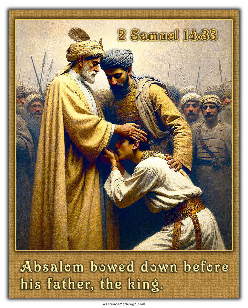Looking at the text of these few verses, Joab effectively relayed Absalom’s message to David. Absalom apparently told the king what he wanted to hear and was subsequently kissed by his father the king (v. 33). That kiss was the sign of David’s restored favor of his son Absalom, whom he loved — despite what he’d done. He realized that it was good to have Absalom home again. David probably felt like the father in Jesus’ Parable of the Prodigal Son (Luke 15:11–32). Like that father, David was also ready to celebrate his son’s return with a genuine hug and kiss!