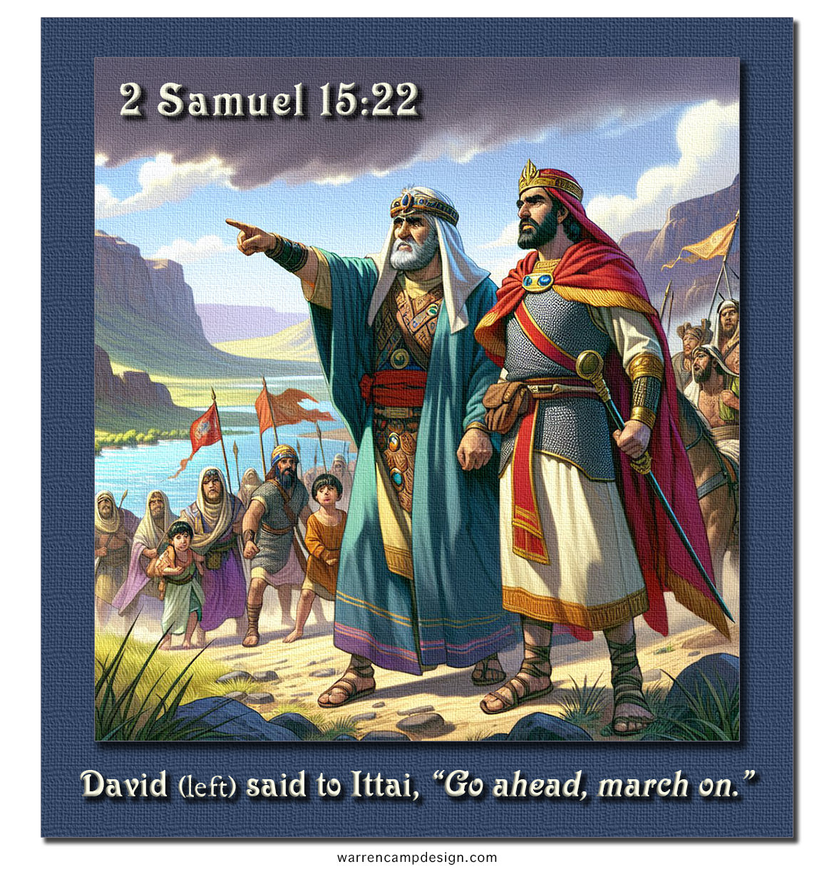 Ittai the Gittite’s commitment to King David during Absalom’s rebellion is one of the most powerful and celebrated acts of loyalty in all of scripture. David urged him not to follow, but Ittai wouldn’t consider abandoning him. His commitment appears to be more than a personal attachment to David; it seems to have been part and parcel of his faith. He began his statement with the words, “As surely as the Lord lives,” which suggests that he was a true believer in the God of Israel and had no intention of going back to his own land and his own gods. So the Gittites, their families, and hundreds of others marched by, on their way to exile and a very uncertain future.