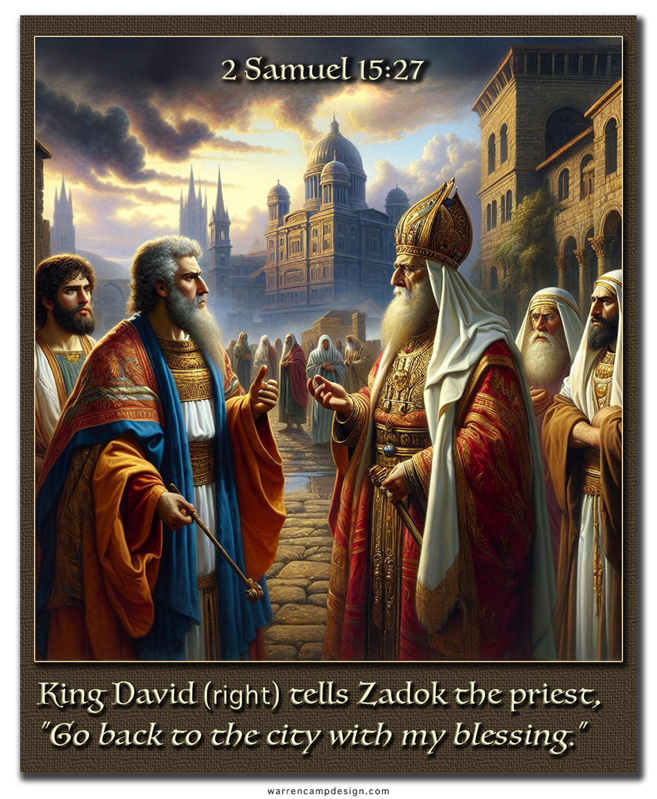 Through his tears, his mourning, and his repentance, we see a faith-filled, obedient David. But we’ll soon see David being the consummate strategist who’ll use the priests to set up an intelligence network inside occupied Jerusalem. David will ask Zadok the priest to use his eyes to observe what Absalom was doing, then send a report to David via his son Ahimaaz and Abiathar’s son Jonathan. David will wait at the west side of the ford, over the Jordan near Gilgal, until he receives word what to do next.