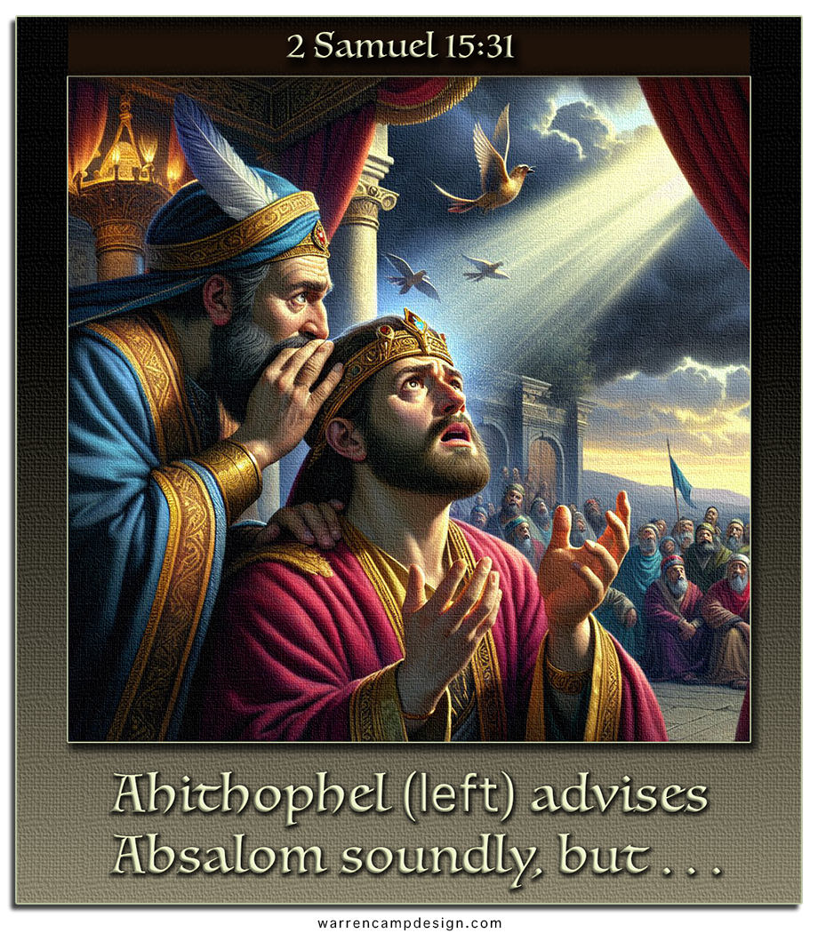 Then David received a report revealing that his wisest counselor, Ahithophel, had joined Absalom’s revolt. David’s reaction to learning that his trusted counselor, Ahithophel, had joined his son Absalom’s revolt was one of deep distress, alarm, and immediate spiritual reliance, indicating immense disappointment and sadness compounded by the political danger. That news became a most devastating blow for King David because Ahithophel’s previous counsel had been so reliable. His advice amounted to words coming from a teacher or rabbi who’d inquired of God’s word. Because David had been seeking God’s intercession, he was constantly in prayer, so he prayed: “LORD, turn Ahithophel’s counsel into foolishness” (v. 31b).