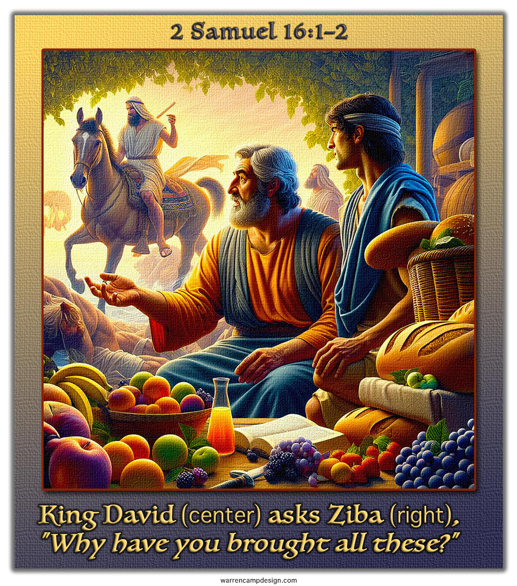 • Ziba meets King David with a tremendous amount of supplies, while claiming that Mephibosheth stayed in Jerusalem to seek restoration of Saul’s kingdom, leading David to give Mephibosheth’s property to Ziba (vv. 1–4).