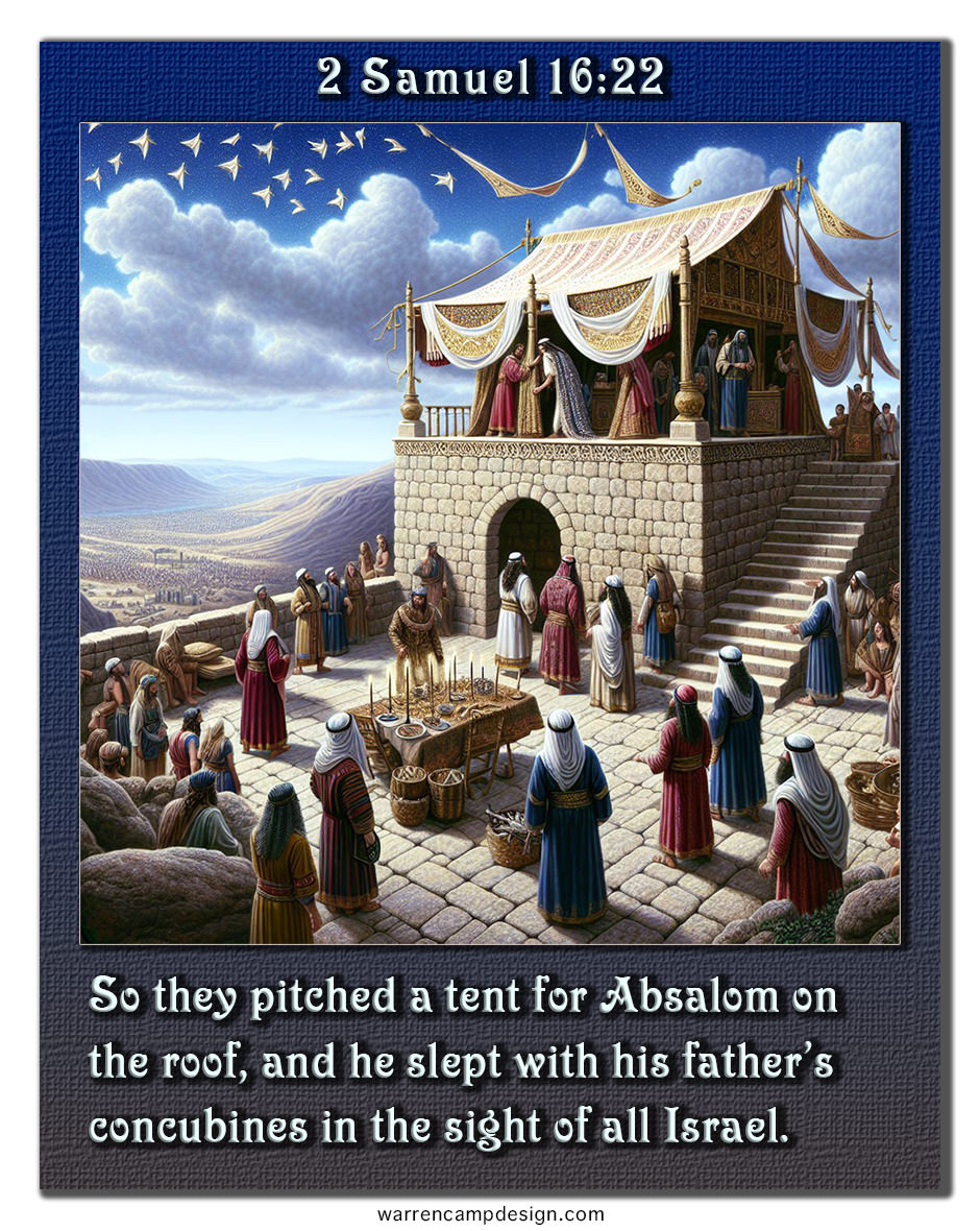 “So they pitched a tent for Absalom on the roof, and he slept with his father’s concubines in the sight of all Israel” (v. 22). That tent was pitched publicly — possibly on the same rooftop from which David had ogled Bathsheba — and word was spread regarding the significance of Absalom’s acts of domination. By taking David’s ten concubines, Absalom showed his supporters that he’d never be reconciled to David, and so strengthened their commitment to him.