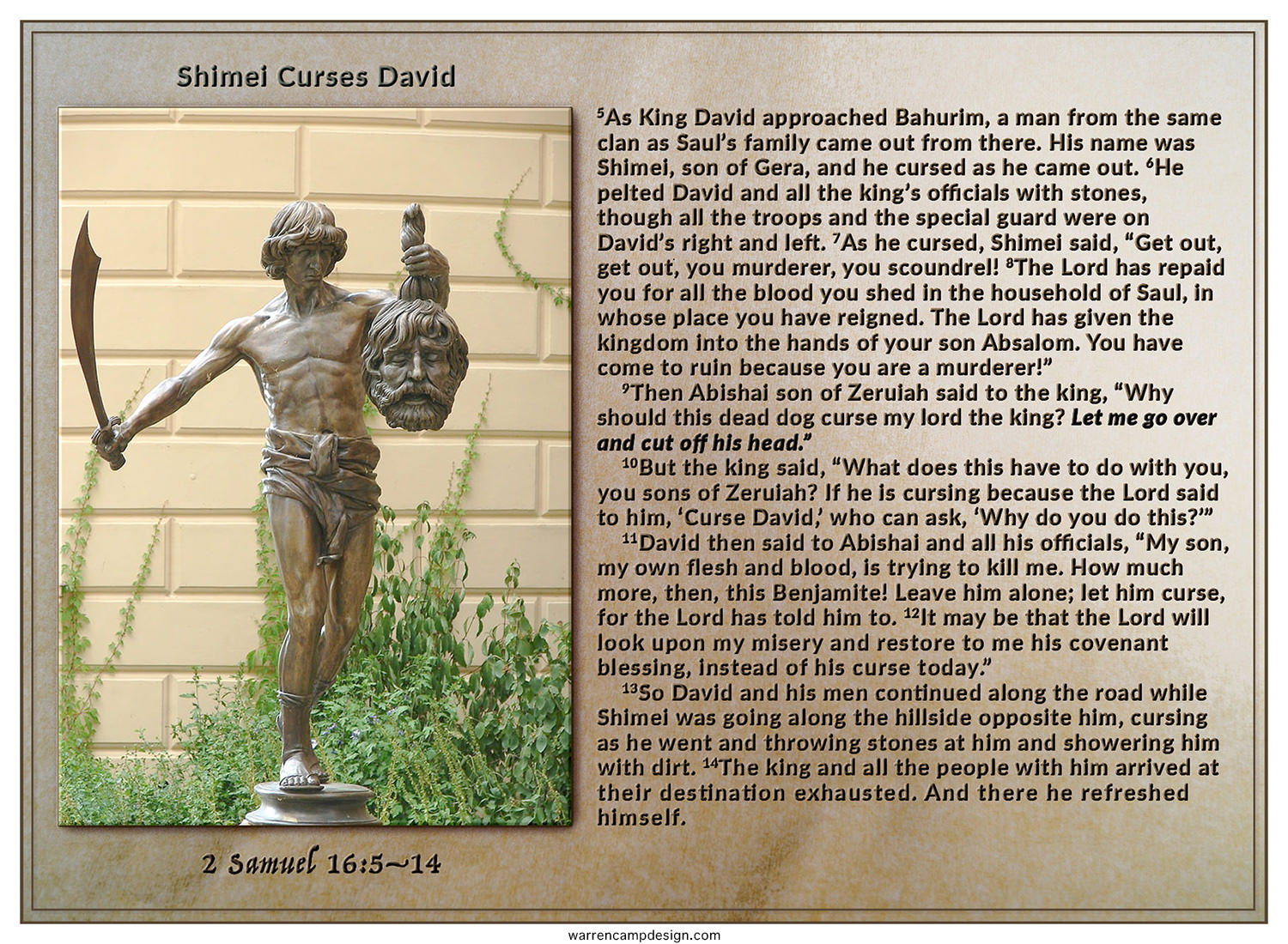• Shimei, who is loyal to the house of Saul, curses King David, accusing him of bloodshed, but David refuses to retaliate, all the more accepting the possibility that Father God sent him to curse and stone David (vv. 5–12).