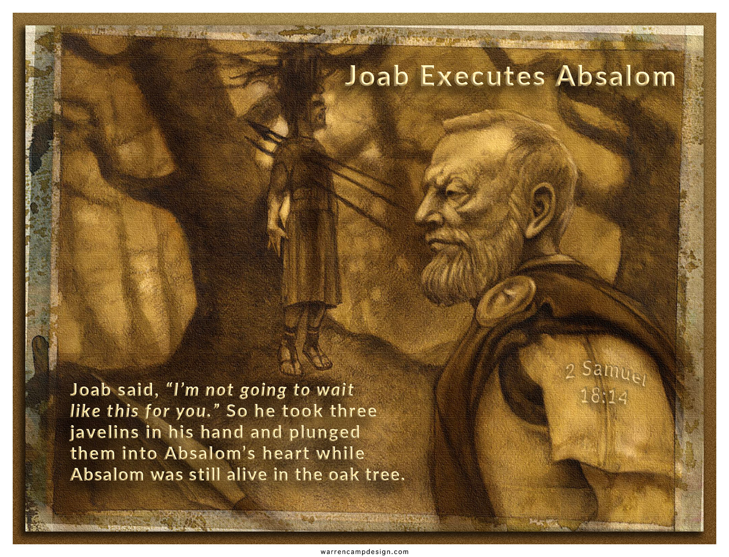 From what the author tells us, Joab had had just about enough of that fellow’s submission to the king’s orders. Joab would take care of the matter personally. So he went and found Absalom just where and how the young man had accounted. He took three spears in his hands and thrust them through Absalom’s chest. His armor bearers followed suit, finishing off Absalom (vv. 14–15). David’s enemy was dead.