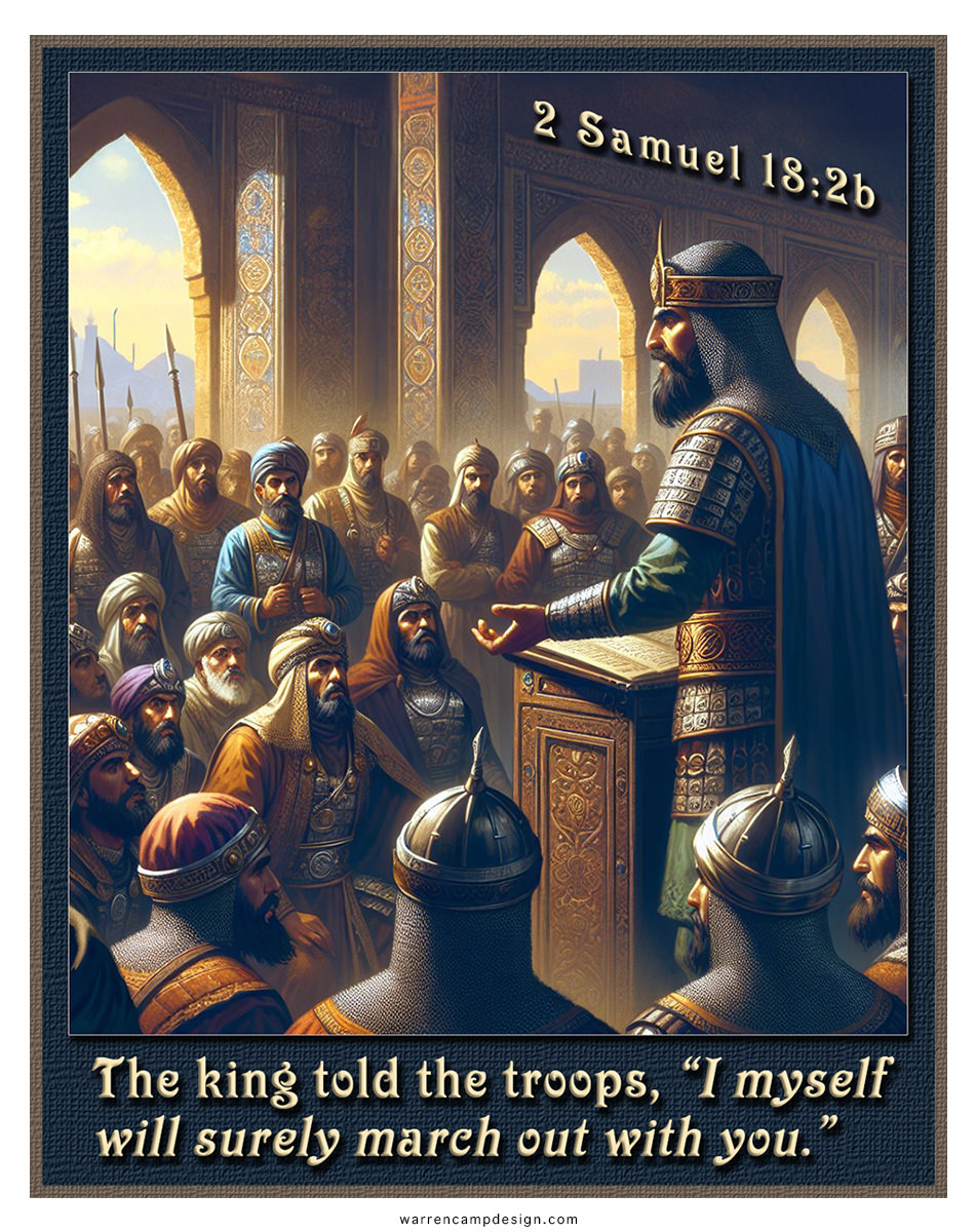 • David divides his forces under Joab, Abishai, and Ittai, but remains in the city after his men insist he shouldn’t go into battle (vv. 1–4).